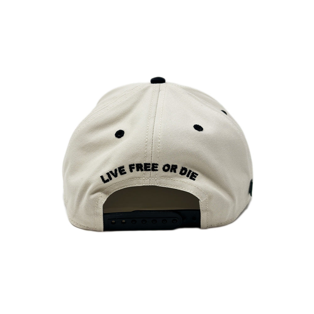 NH state silhouette raised embroidery on front panel and LIVE FREE OR DIE embroidered on back above snapback.